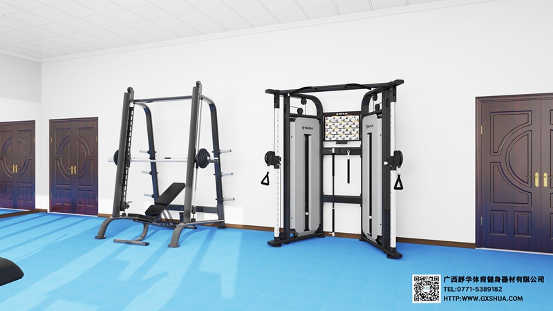 5.快盈VIII史密斯机SH-G6853*1台-锻炼股四头肌、股二头肌、肱三头肌;史密斯机采用固定轨迹的杠铃设计,大大降低了训练过程中的安全风险,通过深蹲、卧推、肩推等经典动作,可以针对性地锻炼腿部力量、上肢力量、背部肌群、胸部塑形以及肩部稳定等,从而全面提升身体素质,满足不同的健身需求;