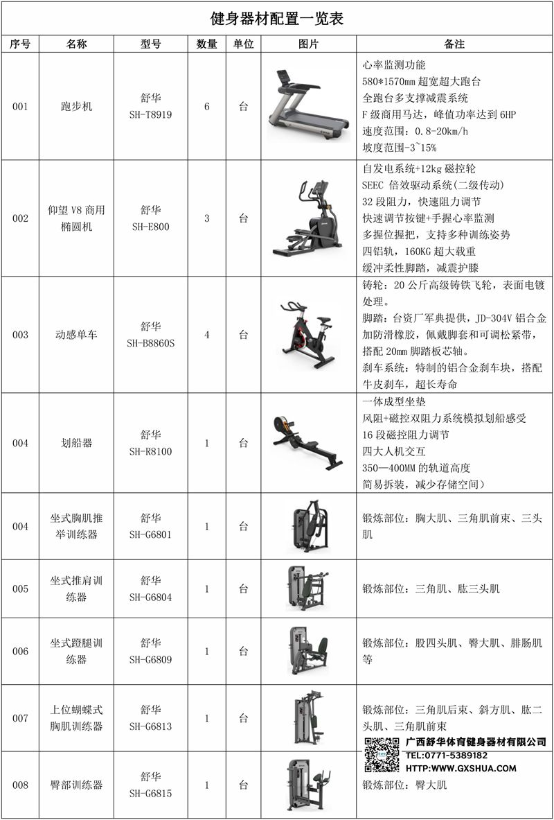1.快盈VIIIV9智能跑步机SH-T8919*6台-独立仪表-简洁大气,全新外观设计,健康运动新选择;心率监测功能,可通过手握心率、无线心率带等不同方式实时采集心率数据;580*1570mm超宽超大跑台-跑感舒适,跑台整体安全稳定;全跑台多支撑减震平台,保证跑台超强支撑力,达到180kg支撑,满足专业健身房需求。F级商用马达-超强马达,AC 3.0HP 交流,峰值功率达到6HP,F级商用品质。速度范围达到0.8-20km/h;V9跑步机可实现跑台扬升功能,坡度范围-3~15%,满足客户不同的锻炼需求。