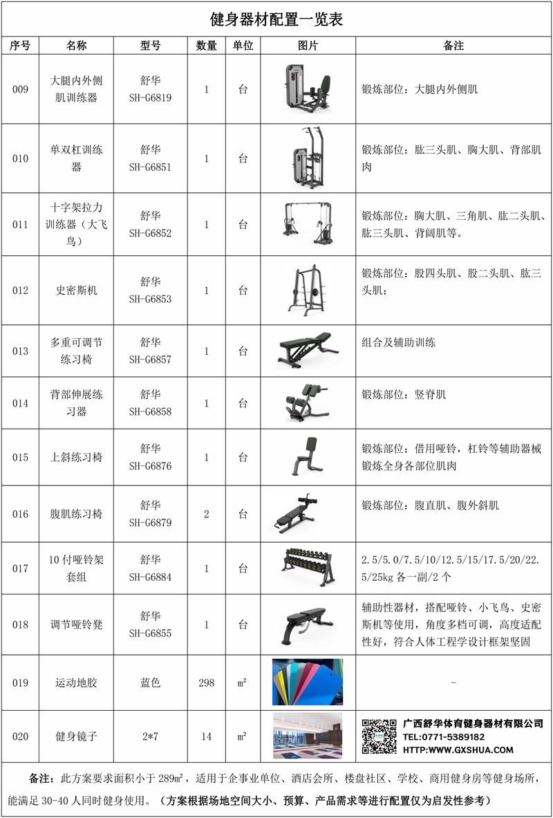此方案要求面积小于289m²,适用于企事业单位、酒店会所、楼盘社区、学校、商用健身房等健身场所,能满足30-40人同时健身使用。(方案根据场地空间大小、预算、产品需求等进行配置仅为启发性参考)