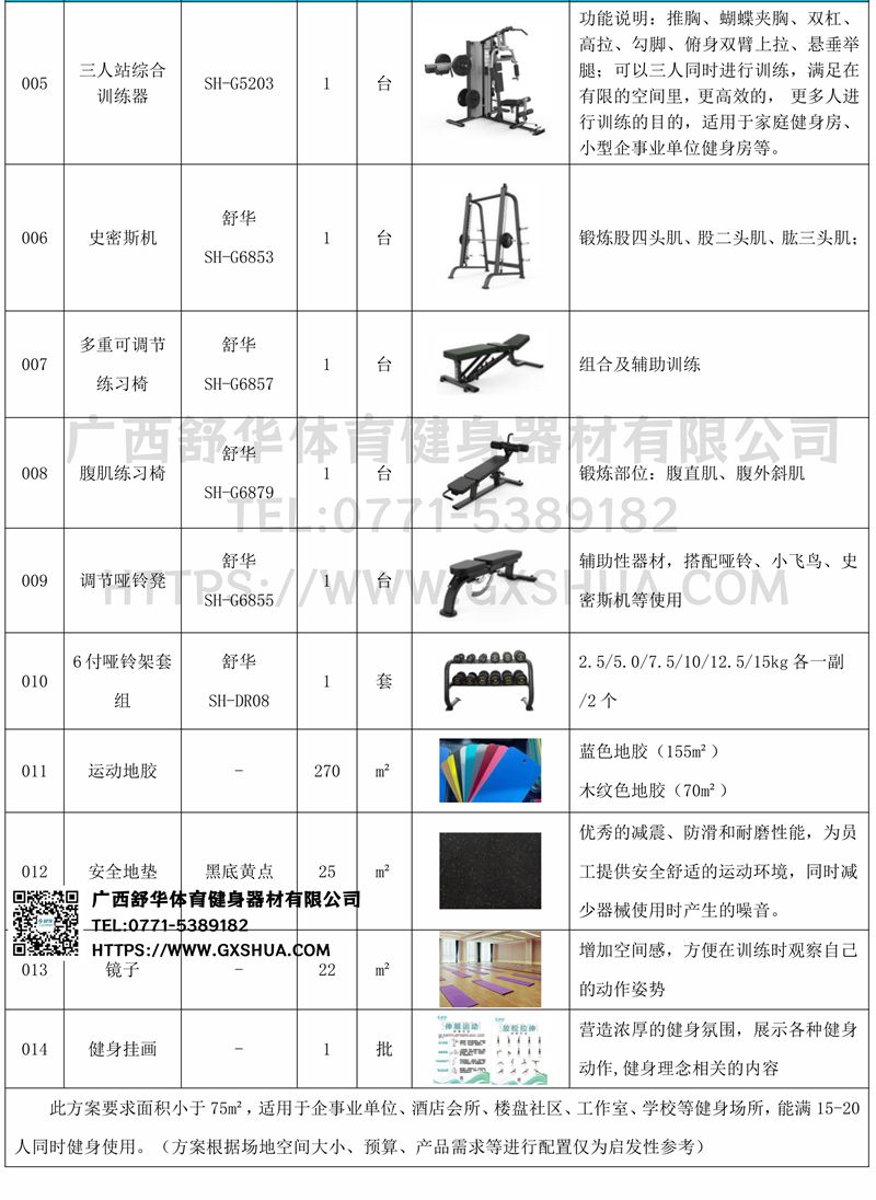 史密斯机(1台),多重可调节练习椅(1台),腹肌训练器(1台),6付哑铃套组(1套),可调哑铃凳(1张),可以实现对不同肌肉群的针对性训练,满足肌肉训练需求,全方位激活身体机能。