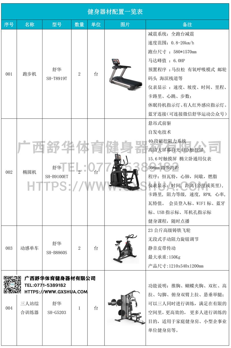1.快盈VIIIV9跑步机SH-T8919T*2台-V9+采用全跑台减震设计,为跑者提供舒适的落脚地感和稳定的跑步支撑,良好的缓冲防护,降低膝关节受伤风险。商用大跑台,为跑者提供从容奔跑空间,180kg承载力,580*1570纯跑台面积,满足专业健身需求。V9+采用F级商用马达,6HP峰值马力,20km/h最高速度,提供源源不断的动力。V9+内置健身直播软件,每周提供直播课程,内含大量专业线上健身点播课程,可为健身房不同人群提供多样化健身课程服务。