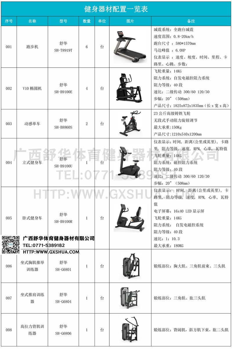 1.快盈VIIIV9跑步机SH-T8919T*6台-V9+采用全跑台减震设计,为跑者提供舒适的落脚地感和稳定的跑步支撑,良好的缓冲防护,降低膝关节受伤风险。商用大跑台,为跑者提供从容奔跑空间,180kg承载力,580*1570纯跑台面积,满足专业健身需求。V9+采用F级商用马达,6HP峰值马力,20km/h最高速度,提供源源不断的动力。V9+内置健身直播软件,每周提供直播课程,内含大量专业线上健身点播课程,可为健身房不同人群提供多样化健身课程服务。