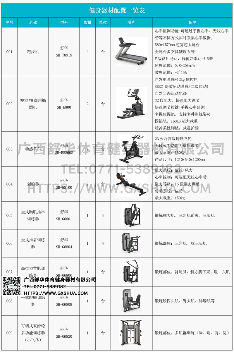 1.快盈VIIIV9跑步机SH-T8919*4台-580*1570mm超宽超大跑台,全跑台多支撑减震平台,保证跑台超强支撑力,达到180kg支撑,满足专业健身房需求。F级商用马达-超强马达,AC 3.0HP 交流,峰值功率达到6HP,F级商用品质。速度范围达到0.8-20km/h;V9跑步机可实现跑台扬升功能,坡度范围-3~15%,满足客户不同的锻炼需求。